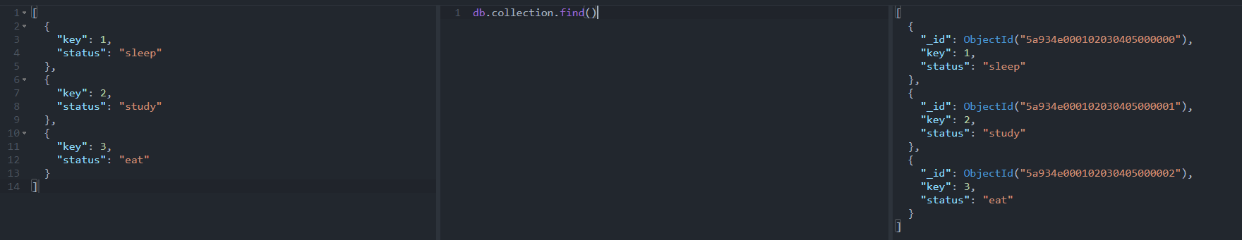 // SQL 문법 SELECT * FROM collection WHERE status = "sleep" // mongoDB 문법 db.collection.find({ status: "sleep" })특정 조건에 해당하는 document만 쿼리 하는 방법입니다.