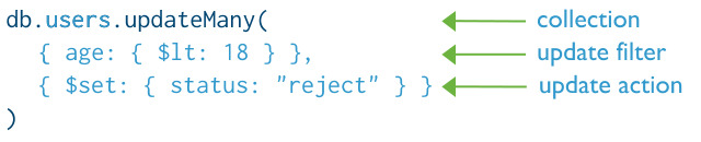 db.collection.updateOne( { name: "Brazil" }, { $set: { age: 7 } } );위의 쿼리는 updateOne operation을 활용하여 filter와 action을 넣어줄 수 있습니다.