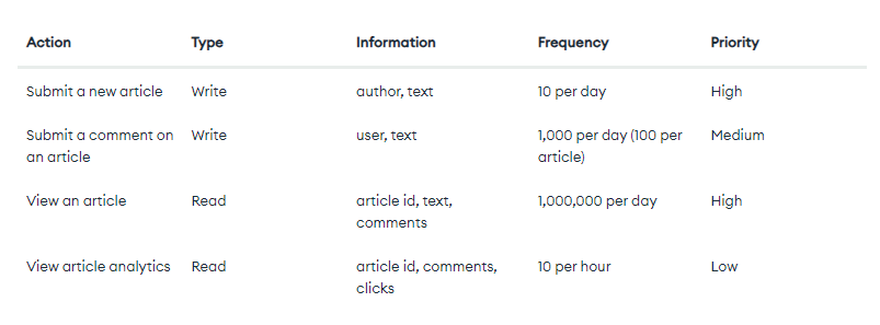 https://www.mongodb.com/docs/manual/data-modeling/schema-design-process/identify-workload/#std-label-data-modeling-identify-workload Action은 유저가 하는 행위, Information은 쿼리에서 작성되거나 반환되는 문서 필드를 뜻합니다.