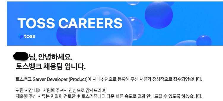 사내추천 서류접수 블로그를 통해 인연이 닿은 토스뱅크의 서버개발자 한분에게 사내추천을 받아 서류 전형을 진행하였습니다.
