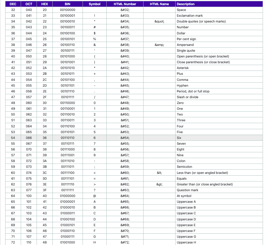 ASCII 해당 표는 ASCII라는 Charset이며 문자 A는 01000001로 인식되고 숫자 6은 00110110으로 인식됩니다.