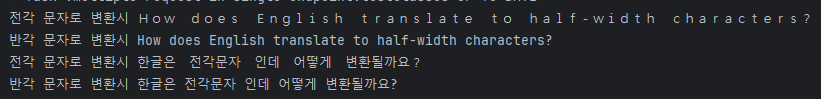 @Test fun `반각 문자 전각 문자 변환 테스트`(){ val english = "How does English translate to half-width characters?" println("전각 문자로 변환시 ${english.toFullWidthCharacter()}") println("반각 문자로 변환시 ${english.toHalfWidthCharacter()}") val koreanText = "한글은 전각문자 인데 어떻게 변환될까요?" println("전각 문자로 변환시 ${koreanText.toFullWidthCharacter()}") println("반각 문자로 변환시 ${koreanText.toHalfWidthCharacter()}") }테스트 결과